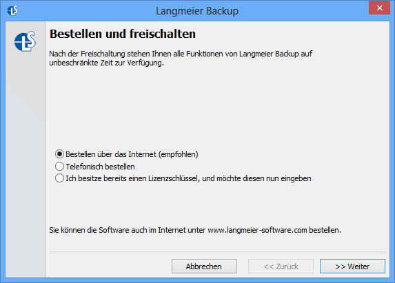 Haben Sie sich entschieden, Langmeier Backup zu kaufen, dann gehen Sie wie folgt vor. Möglichkeit 1: Wenn Sie die Demo-Version von Langmeier Backup schliessen, dann erscheint der folgende Bildschirm. Klicken Sie auf "Bestellen über das Internet (empfohlen)", oder auf "Telefonisch bestellen".