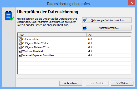 Für eine seriöse Datensicherung ist es jedoch unerlässlich, dass Sie die Zuverlässigkeit Ihrer Hardware überprüfen. Es kann nämlich sein, dass bei unzuverlässiger Hardware einzelne Bits oder ganze Bit-Reihen nicht korrekt auf das Sicherungs-Medium niedergeschrieben werden, oder, dass sich einzelne gespeicherte Bits mit der Zeit selbständig verändern. So kann es vorkommen, dass eine Datei, die Sie auf ein bestimmtes Sicherungs-Medium gesichert haben, nach einer Weile nicht mehr lesbar ist. Um festzustellen, ob alle Dateien korrekt auf dem Sicherungs-Medium abgelegt sind, gibt es in Langmeier Backup die Möglichkeit, die Datensicherung auf Integrität zu überprüfen. Klicken Sie in der linken Schnellzugrifssleiste auf "Prüfen", um den Assistenten aufzurufen. Im ersten Schritt des Assistenten sehen Sie den geöffneten Sicherungs-Auftrag vor sich. Sie können einen anderen Auftrag öffnen, indem Sie auf den Knopf "Auftrag öffnen" klicken. Setzen Sie die Häkchen, damit die Elemente geprüft werden!