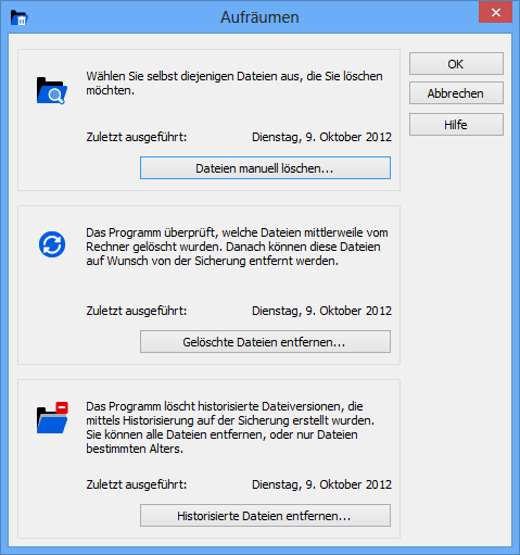 Wer regelmässig eine Datensicherung macht, hat vielleicht bald ein Problem mit dem Speicherplatz. Langmeier Backup bietet einen Assistenten zum Äufräumen an. Damit können Sie auf der Sicherung wieder zusätzlichen Platz schaffen! Klicken Sie auf Extras > Aufräumen..., oder einfach auf "Aufräumen", um das Fenster zu öffnen. Hinweis: Das Fenster "Aufräumen" wird Ihnen auch angezeigt, nachdem Sie bei der Meldung "Zu wenig Speicherplatz auf dem Datenträger" auf den Knopf "Speicherplatz freimachen" klicken.